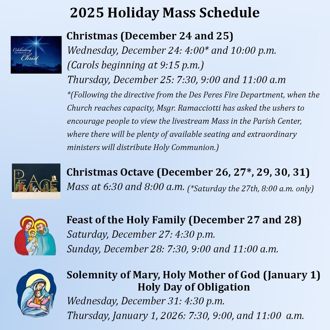 So that you may plan accordingly, here is the schedule for Masses during the holiday season at St. Clement of Rome: