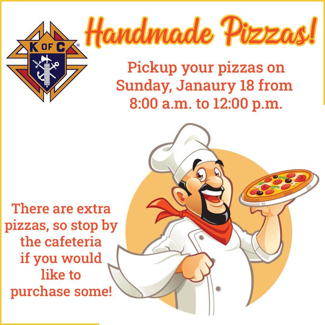 If you ordered pizzas from the Knights of Columbus, pizza pickup is Sunday, January 18, from 8:00 a.m. until 12:00 p.m. in the St. Clement School Cafeteria.
